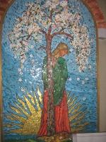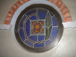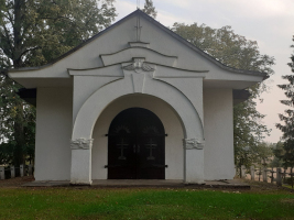 * Aiz vārtiem atrodas balta kapliča ar art deco stila durvīm, vitrāžu un mozaīku rotājumiem.