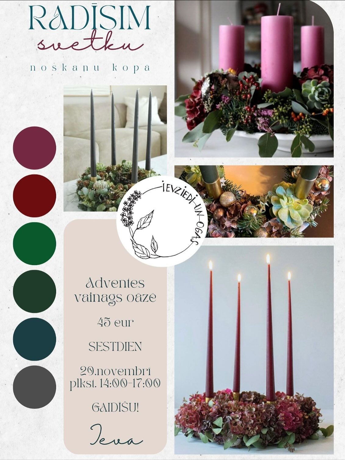 29. novembrī 14.00-17.00 tiks veidots mazliet savādāks adventes vainags - oāzē. Cenā iekļautas arī sveces.Meistarklases cena 45 Eur.