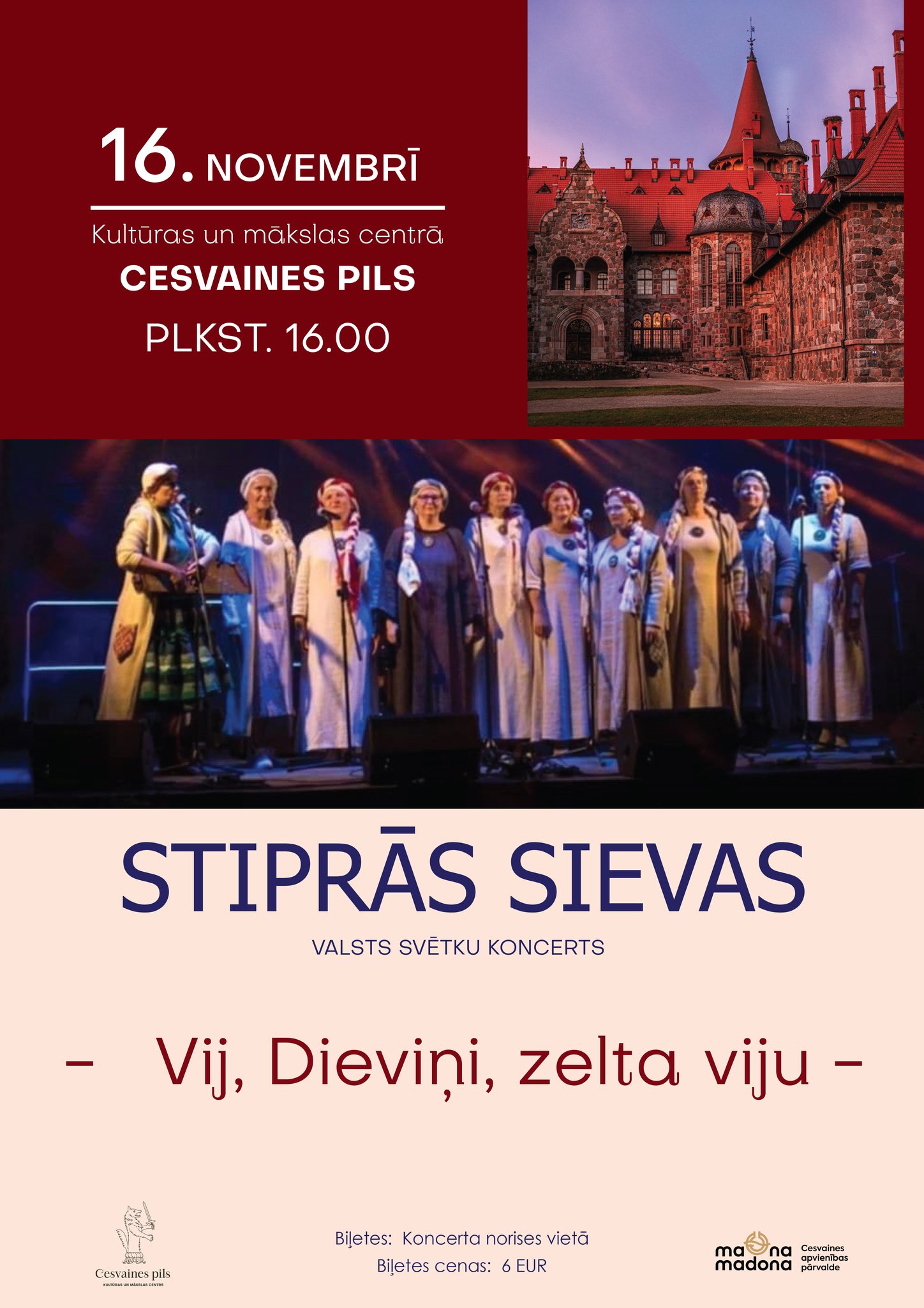 Tuvākais notikums gaidāms 16. novembrī, kad Cesvaines pili pieskandinās ansamblis “Stiprās sievas”, kas valsts svētku priekšvakarā sniegs koncertu “Vij, Dieviņi, zelta viju”. Pasākums sāksies pulksten 16.00. Klausītājiem būs iespēja dzirdēt tautasdziesmas un melodijas folkloras noskaņās. Būsim kopā valsts svētkos un baudīsim patiesi latviskas mūzikas programmu, kā arī būs iespēja aplūkot Skrides fonda konkursā iesūtīto fotogrāfiju izstādi.