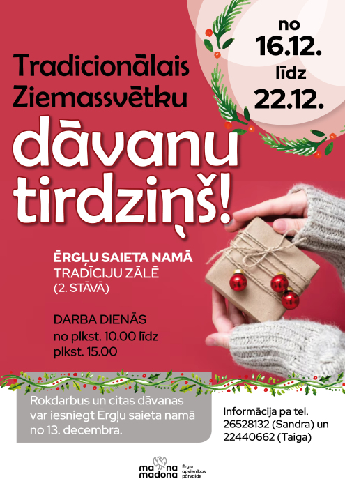 No 16. decembra līdz 22. decembrim Ērgļu saieta nama Tradīciju zālē (2. stāvā) aicina ZIEMASSVĒTKU TIRDZIŅŠ.