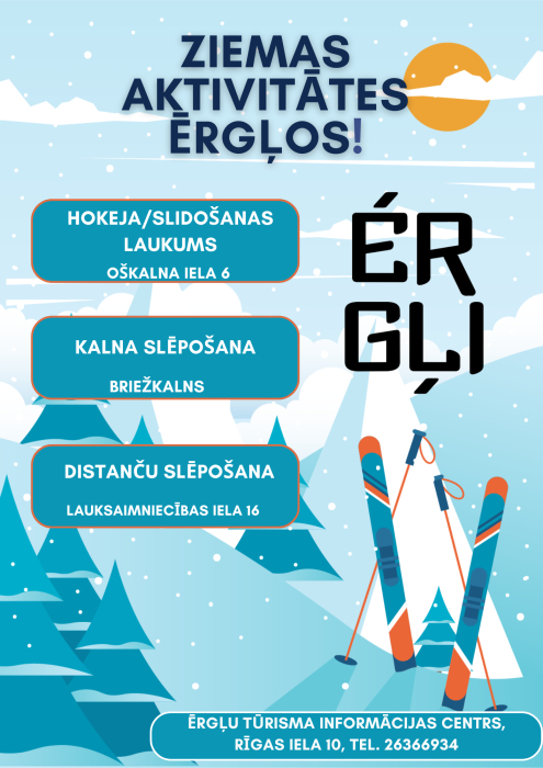 Slēpju noma Oškalna ielā 6, blakus Ērgļu pamatskolai (par nomu zvanīt tel. 29219384).