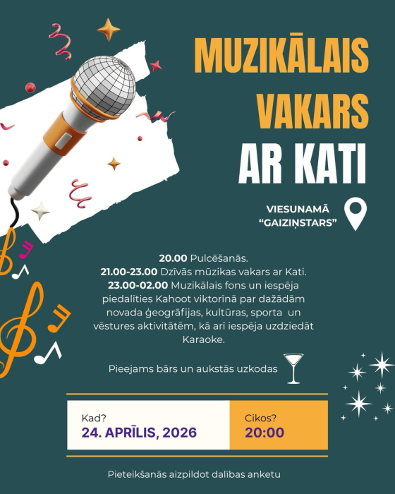 plkst. 23.00 – 02.00 Muzikālais fons, iespēja dziedāt karaoke un piedalīties Kahoot viktorīnā par novada ģeogrāfiju, kultūru, sportu un vēsturi.