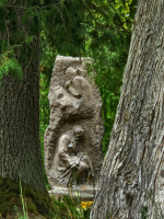 * A. Saulieša pieminekļa priekšā redzami arī viņa meitas Ilzes un dēla Jāņa kapi, bet rakstnieka vecāku un divu brāļu kapa vieta atrodas netālu no pieminekļa, iezīmēti ar dzelzs krustu.