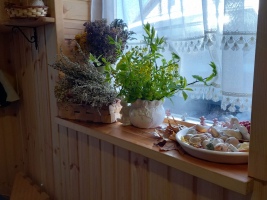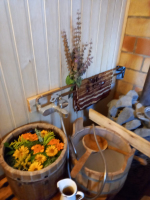 * Pirtiņa un pirts rituāls (pirts pēriens ar augiem, augu skrubjiem, medus masāžu, atpūtu baļļā).