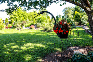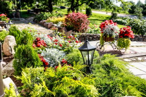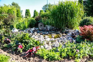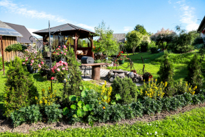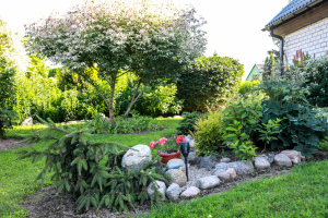 * В компактном саду - клумбы, декоративные кустарники, фруктовые деревья, небольшие фонтаны и уголки для отдыха.