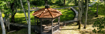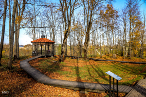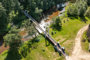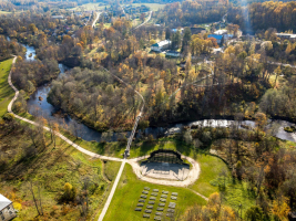 * В конце городища находится деревянная беседка, с которой открывается чудесный вид на извилины реки Огре. Ее потолки украшены историческими рисунками, а крышу украшает флюгер - орёл.